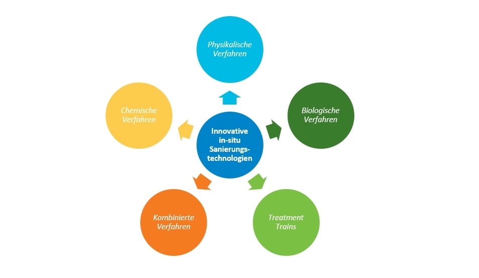 Zu unterscheiden sind für die Sanierung physikalische, chemische und biologische In-situ-Verfahren sowie räumlich und/oder zeitlich kombinierte Verfahren. Physikalische Verfahren verändern den Aggregatzustand oder die Lage der Schadstoffe und mobilisieren sie dadurch. Dagegen wandeln chemische und biologische Verfahren die Schadstoffe in der Regel in weniger schädliche Stoffe um oder bauen sie vollständig ab. So werden dem Grundwasserleiter bei der chemischen In-situ-Oxidation (ISOC) etwa Oxidationsmittel hinzugefügt, welche die Schadstoffe „kalt verbrennen“ und abiotisch zerstören. Bei den biologischen In-situ-Verfahren werden Nährstoffe oder spezielle Mikroorganismen injiziert, welche die Schadstoffe direkt im Grundwasser abbauen.