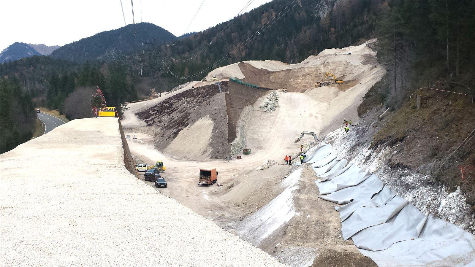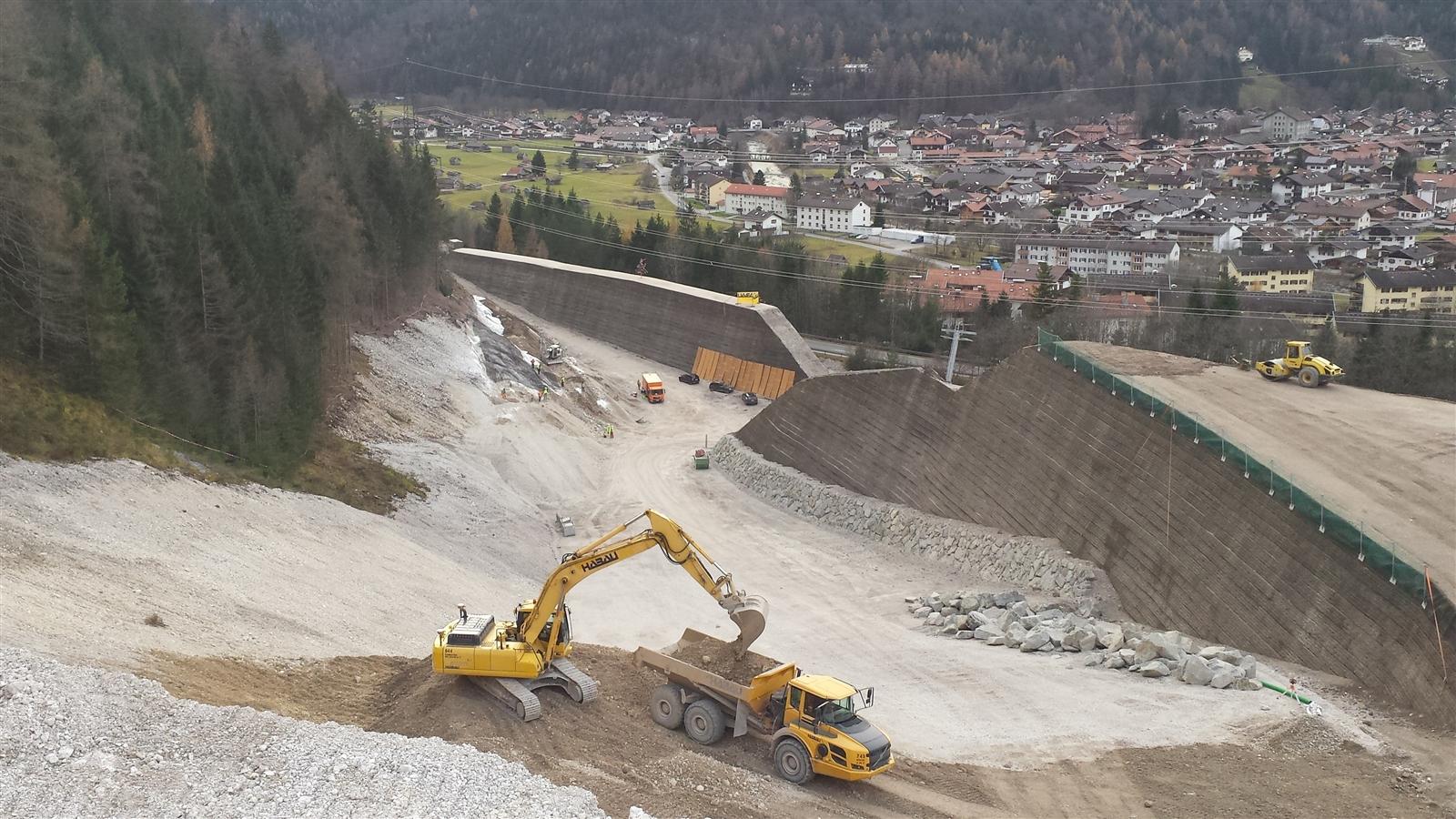 Dazu wurden insgesamt etwa 170.000 Kubikmeter Erde, Geröll und Gestein bewegt. Sie bildeten die Bausubstanz für die Dämme, die dann mit einem Geotextilgitter als Stützkonstruktion ummantelt wurden. Experten sprechen hier von der bewehrten Erde-Technik.