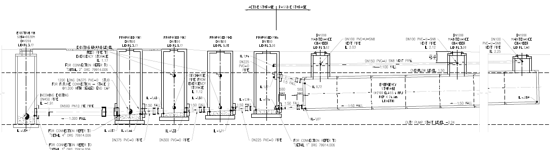 The emergency storage tanks are utilised as passive storage during overload or failure of the SPS. They consist of rubber ring jointed pipes as a horizontal storage solution or a precast maintenance hole as a vertical storage solution. The storage tanks fill via a feed line connected to a maintenance hole or directly to the SPS wet well with an obvert level 100mm below the SPS overflow level.