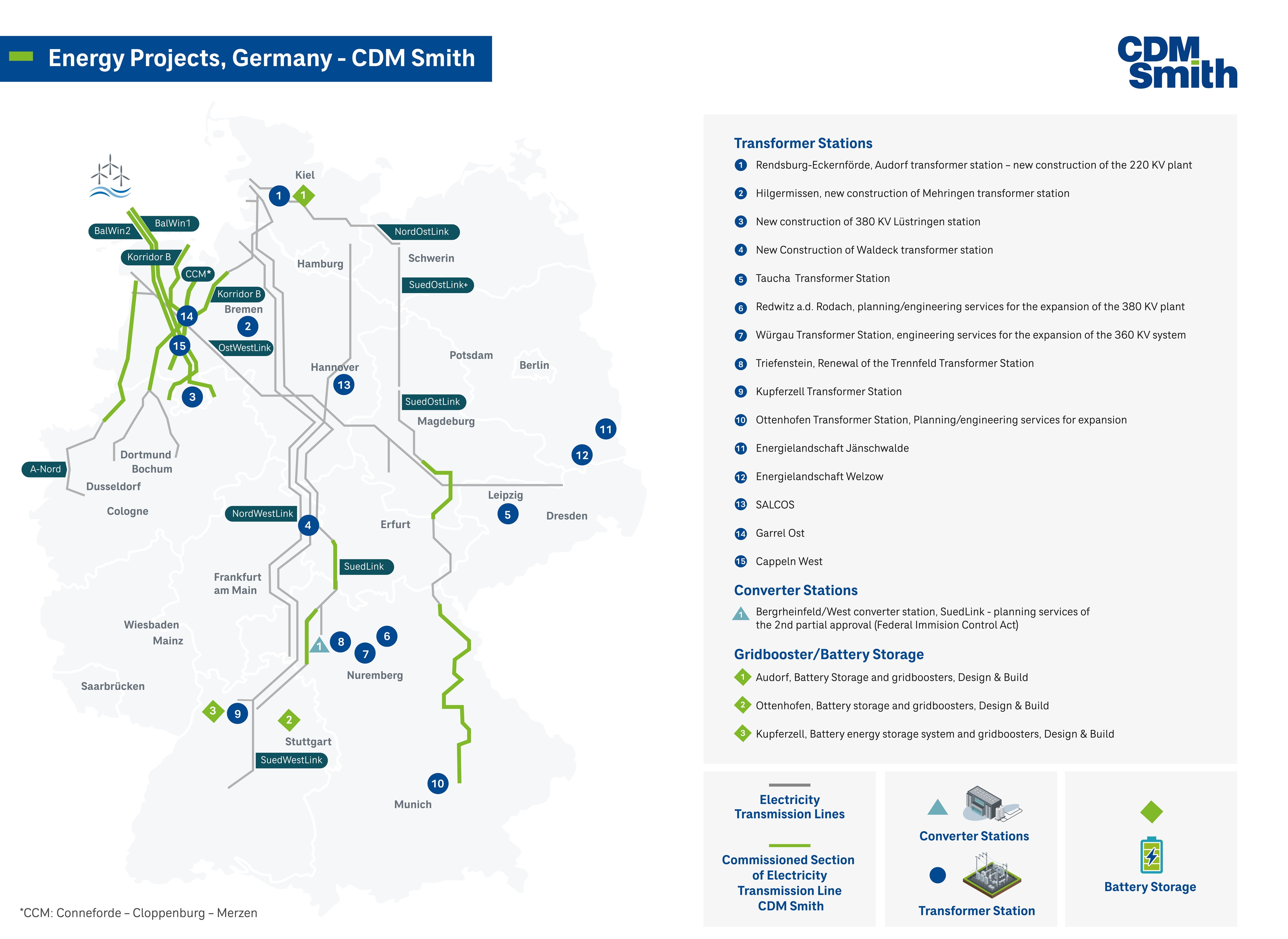 When considered together, innovative energy management and sustainable facility development deliver synergistic solutions. We advise public and private clients on energy management, the generation and use of all types of regenerative energies including solar, geothermal, and wind, as well as energy generation from sewage and biomass. We instead integrate our energy concepts with the know-how and project solutions skills of the other business areas of CDM Smith. The economic and technological efficiency of these integrated strategies contributes to our clients’ business success and sustainable growth.