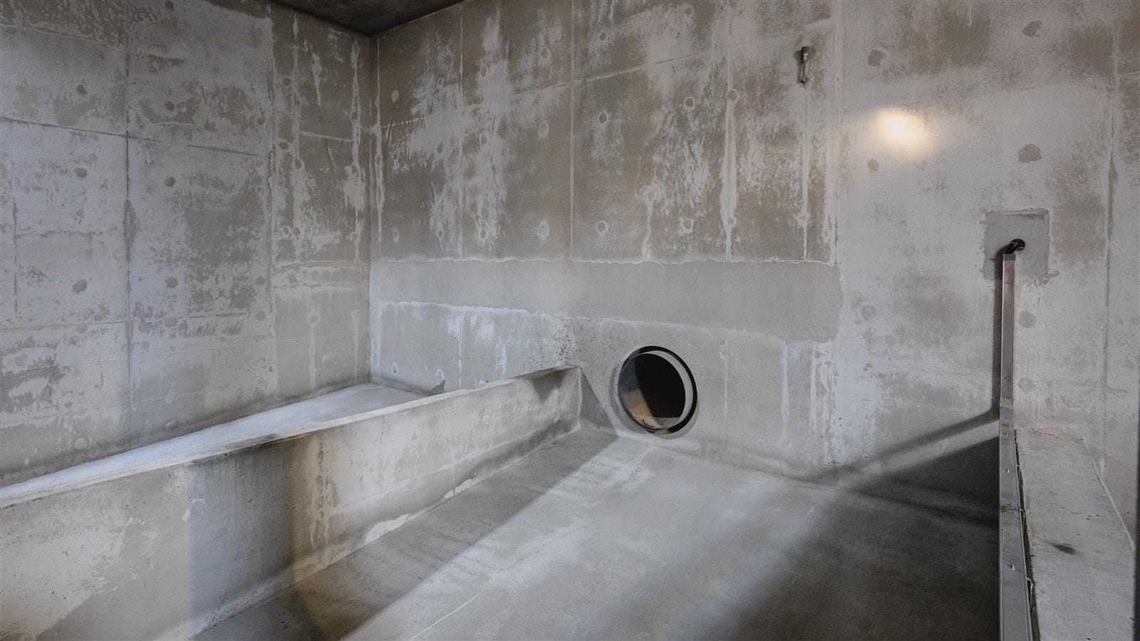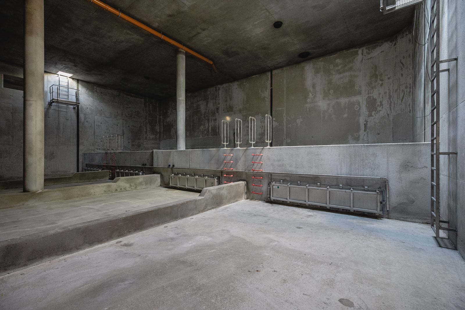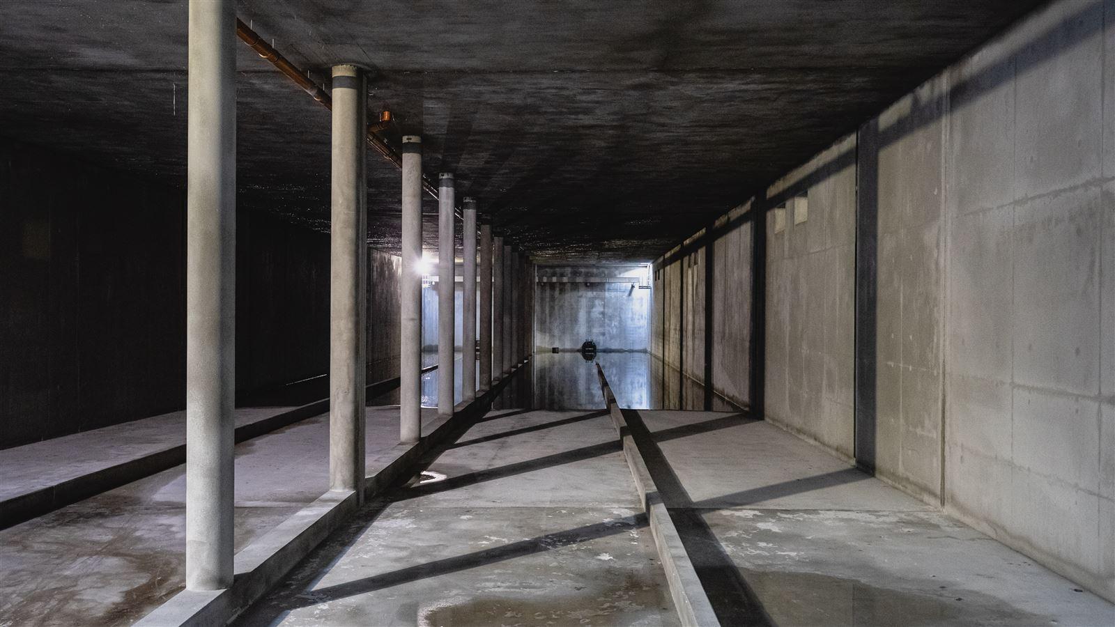 Wastewater retention tank, with a total active capacity of 81750 m3, consisting of six segments with a capacity of 13625m3, each designed as an independent, two-part, rectangular reinforced concrete chamber, partially recessed in the ground, closed with a reinforced concrete ceiling.